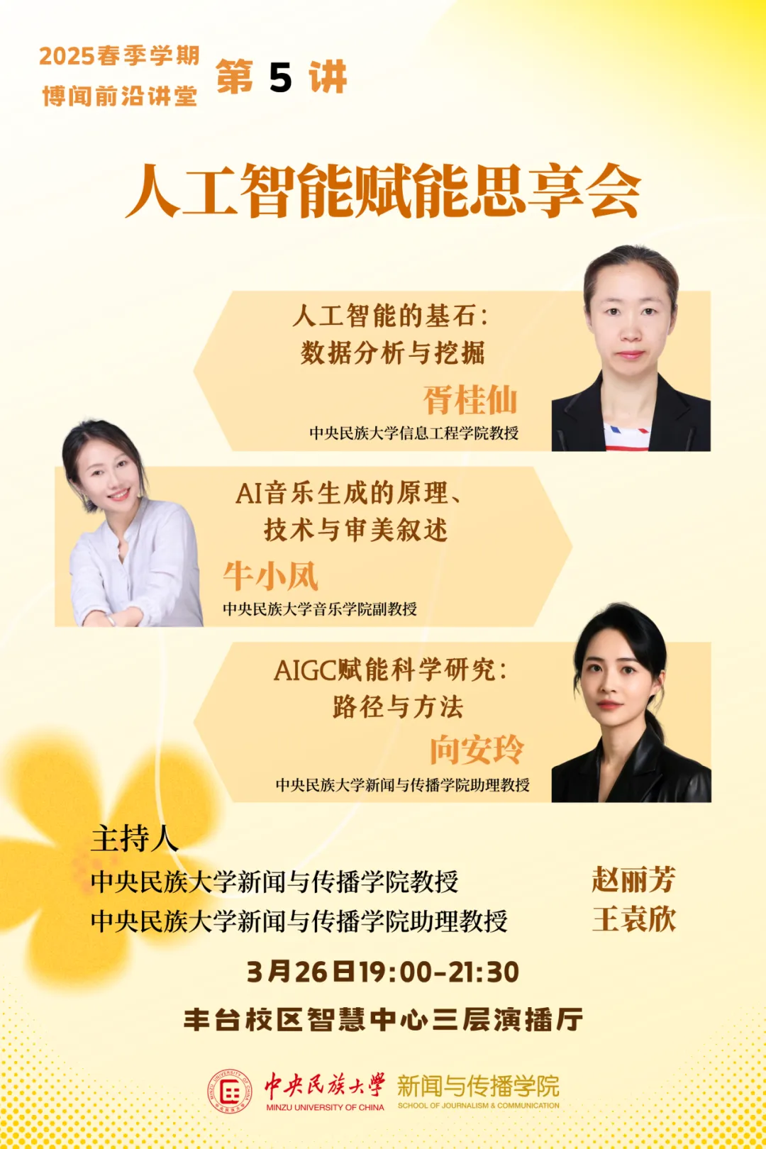 新闻网讯 3月26日晚,由新闻与传播学院举办的2025春季学期博闻前沿讲堂第5讲暨第一期“人工智能赋能思享会”在丰台校区演播厅举行。信息工程学院教授胥桂仙、音乐学院副教授牛小凤、新闻与传播学院助理教授向安玲先后登台,以跨界视角揭秘AI技术逻辑,畅谈未来应用图景。各学院百余名师生现场参与。