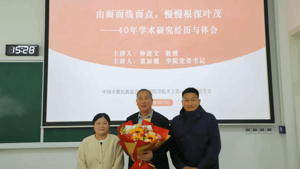 如今,即使已经卸下院长职务,钟进文老师守护民族文化根脉的初心,40年如一日,坚如磐石。他凭借深厚的学术积淀,通过讲座、论文,孜孜不倦地弘扬中华优秀传统文化;他引经据典,用鲜活的故事,深入浅出地阐述各民族文学中蕴含的中华民族精神,揭示其思想内涵与时代价值。他也将继续在教学岗位上,以其对学问的赤诚、对学生的严格与关爱,引领新一代学人在“各美其美,美美与共”的道路上奋进,书写属于他们的精彩答卷。